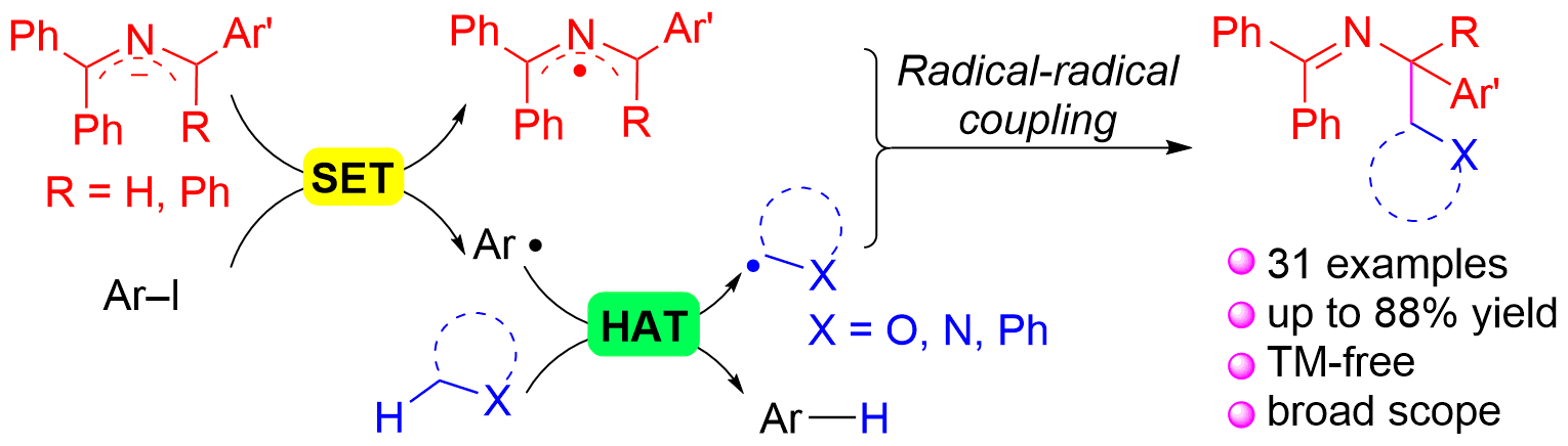該項工作使用氮雜烯丙基陰離子作為超電子給體(SED),以大位阻的芳基碘化物作為電子受體,二者通過單電子轉(zhuǎn)移(SET)形成氮雜烯丙基自由基及芳基自由基,后者進一步與飽和雜環(huán)通過氫原子轉(zhuǎn)移(HAT)產(chǎn)生烷基自由基;進而與氮雜烯丙基自由基發(fā)生自由基偶聯(lián)反應(yīng)形成新的CC鍵,一步實現(xiàn)了飽和雜環(huán)C(sp3)H鍵的直接官能團化。此外,研究發(fā)現(xiàn)用該合成策略也可以使甲苯衍生物C(sp3)H鍵活化并與2-氮烯丙基中間體發(fā)生偶聯(lián)反應(yīng)。該合成方法反應(yīng)條件溫和,避免了使用傳統(tǒng)的強氧化劑、過渡金屬、光催化劑及導(dǎo)向基團等。