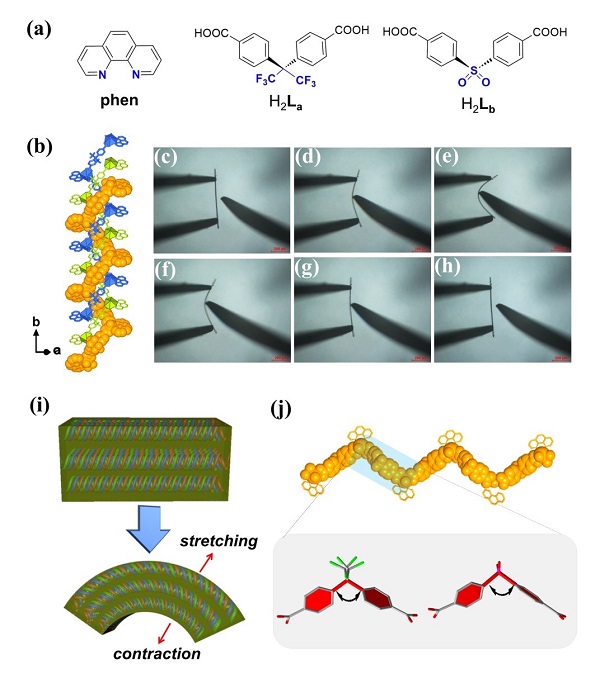 一般而言,晶態(tài)材料因其結(jié)構(gòu)的高度有序性會(huì)表現(xiàn)出較高的機(jī)械強(qiáng)度,但往往也面臨脆性和韌性不足的缺點(diǎn),這一特性在在高分子材料中表現(xiàn)得尤為明顯。石偉群團(tuán)隊(duì)利用半剛性有機(jī)分子設(shè)計(jì)合成了一種具有多重刺激響應(yīng)性能的錒系柔性金屬有機(jī)材料(MOM)晶體。這類MOM晶體化合物以分子彈簧型的三螺旋鏈作為結(jié)構(gòu)單元,顯示了良好的宏觀柔韌性,可以在施加外力或加熱升溫的條件下分別發(fā)生相應(yīng)的力致彈性形變和熱致跳躍響應(yīng)。