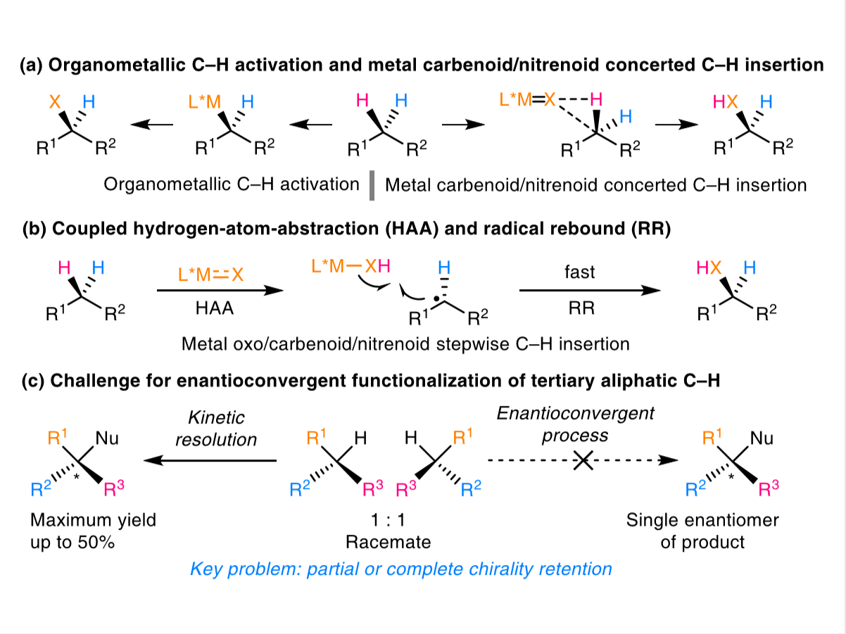 有機(jī)分子中碳?xì)滏I的直接對(duì)映選擇性官能化反應(yīng),具有原子經(jīng)濟(jì)性和步驟簡(jiǎn)潔性等特性,是構(gòu)建碳手性中心的理想方法。近年來,過渡金屬催化的碳?xì)滏I不對(duì)稱反應(yīng)得到了快速發(fā)展,但目前發(fā)展的這些方法一般只適用于前手性碳?xì)滏I的不對(duì)稱官能團(tuán)化。針對(duì)普遍存在的外消旋的三級(jí)碳?xì)滏I,目前仍缺少有效方法利用不對(duì)稱催化實(shí)現(xiàn)其立體匯聚式不對(duì)稱官能團(tuán)化,以100%的理論收率得到手性季碳化合物(圖1)。