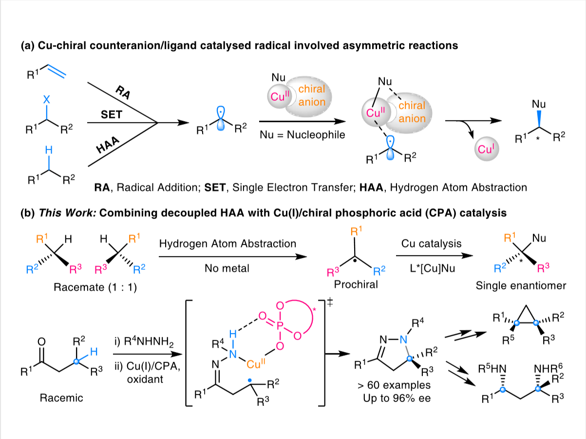 劉心元團(tuán)隊(duì)近年來圍繞基于銅/手性抗衡離子或陰離子配體的單電子轉(zhuǎn)移催化體系,實(shí)現(xiàn)了一系列自由基參與的不對(duì)稱催化反應(yīng)(Acc. Chem. Res. 2020, 53, 170; Chem. Soc. Rev. 2020, 49, 32; Nat. Chem. 2019, 11, 1158;J. Am. Chem. Soc. 2020, 142, 20, 9501 ; Chem 2020 DOI: 10.1016/j.chempr.2020.03.024)。近期,該團(tuán)隊(duì)利用一價(jià)銅/手性磷酸協(xié)同催化體系,成功實(shí)現(xiàn)了芐位/烯丙位烷基碳?xì)滏I的分子內(nèi)不對(duì)稱胺化反應(yīng)(Angew. Chem. Int. Ed. 2020, 59, 1129)(圖2a)。在這些工作的基礎(chǔ)上,最近該團(tuán)隊(duì)利用一價(jià)銅/手性磷酸協(xié)同催化體系,巧妙地通過分子內(nèi)氫遷移的方式,將外消旋的三級(jí)碳?xì)滏I底物轉(zhuǎn)化為前手性的三級(jí)烷基自由基中間體,然后以較慢的速度捕捉手性二價(jià)銅的氮親核試劑,實(shí)現(xiàn)了外消旋三級(jí)碳?xì)滏I的高對(duì)映選擇性立體匯聚式胺化反應(yīng)。該反應(yīng)也可以用兩步“一鍋法”的方式來實(shí)現(xiàn),合成一系列含有季碳手性中心的吡唑衍生物,并通過多樣性轉(zhuǎn)化高效構(gòu)建1,3-二胺和雙季碳環(huán)丙烷等手性骨架(圖2b)。相關(guān)研究成果不僅豐富了銅/手性抗衡離子或陰離子配體的單電子轉(zhuǎn)移催化體系在自由基不對(duì)稱化學(xué)中的應(yīng)用,而且為發(fā)展新的不對(duì)稱催化模式實(shí)現(xiàn)消旋的三級(jí)碳?xì)滏I的立體匯聚式官能化反應(yīng)提供了新思路。