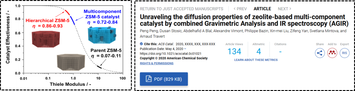 題為《利用重力-原位紅外光譜聯(lián)用技術(shù)(AGIR)研究沸石基多組元催化劑的擴散性能》(Unraveling the Diffusion Properties of Zeolite-Based Multicomponent Catalyst by Combined Gravimetric Analysis and IR spectroscopy (AGIR))的論文發(fā)表在ACS Catalysis上,并被推薦為封面文章。我校博士生彭鵬為第一作者。我校閻子峰教授、Svetlana Mintova教授和法國國家科學(xué)研究中心Arnaud Travert教授為共同通訊作者。該項研究得到國家留學(xué)基金委、王寬誠教育基金會、中法分子篩聯(lián)合實驗室、國家重點研發(fā)計劃、山東省重點研發(fā)計劃與中國石油煉油催化劑重大專項等基金的資助與支持。