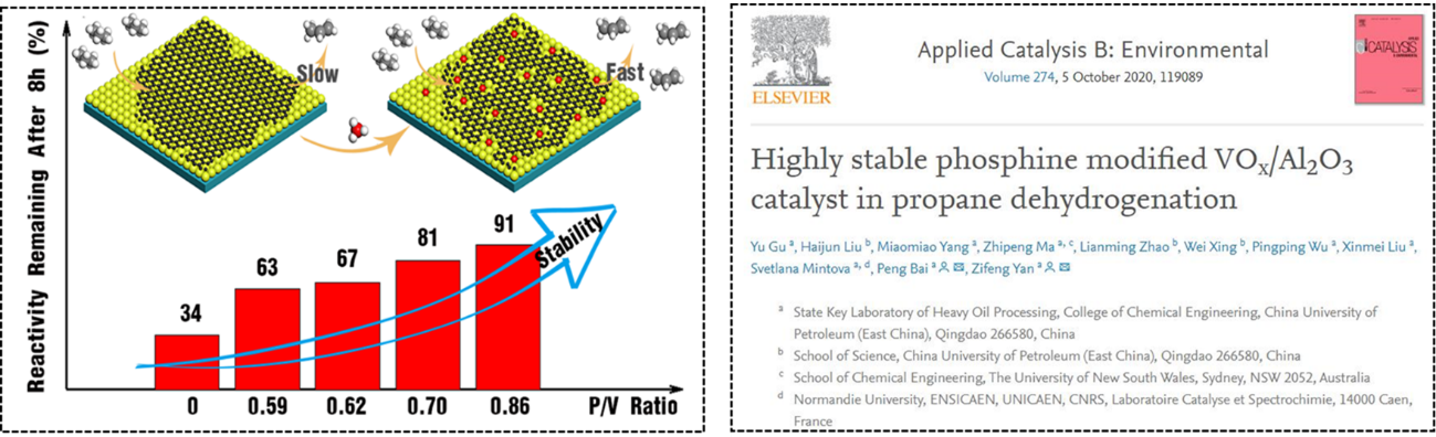 題為《高穩(wěn)定性磷化氫改性的VOx/Al2O3丙烷脫氫催化劑》(Highly stable phosphine modified VOx/Al2O3catalyst in propane dehydrogenation)的論文發(fā)表在Applied Catalysis B: Environmental上。我校博士生顧宇為第一作者,白鵬副教授和閻子峰教授為論文通訊作者。該項工作得到國家自然科學(xué)基金、國家重點研發(fā)計劃專項、中央高校基本科研基金、山東省自然科學(xué)基金以及重質(zhì)油國家重點實驗室基金等項目的資助與支持。