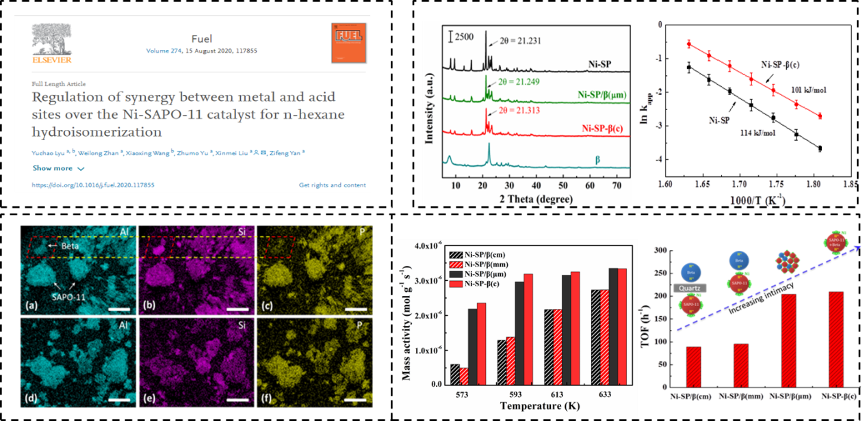 異構(gòu)化催化劑的催化性能與金屬位和酸性位的協(xié)同效應(yīng)密切相關(guān),該協(xié)同包括數(shù)量和距離上的協(xié)同。此項工作通過原位固相法在Ni-SAPO-11催化體系中引入β分子篩以調(diào)控金屬位與酸性位間數(shù)量的協(xié)同,動力學(xué)數(shù)據(jù)表明酸性增強后的催化劑異構(gòu)化反應(yīng)能壘顯著降低,單個金屬位的催化轉(zhuǎn)化頻率(turnover frequency, TOF)顯著增大。催化劑表現(xiàn)出可與商業(yè)鉑基異構(gòu)化催化劑相媲美的異己烷收率。同時,通過調(diào)變催化體系中金屬位與酸性位距離發(fā)現(xiàn),兩活性位距離為微-納尺度時的異構(gòu)化性能優(yōu)于毫米或更大尺度。該項工作不僅獲得高效、低成本的異構(gòu)化催化劑,還可為其它非貴金屬雙功能催化劑的結(jié)構(gòu)設(shè)計提供參考。