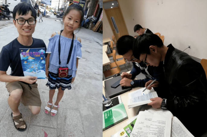 圖為魯楊參與“送故事下鄉(xiāng)”活動和為同學輔導功課