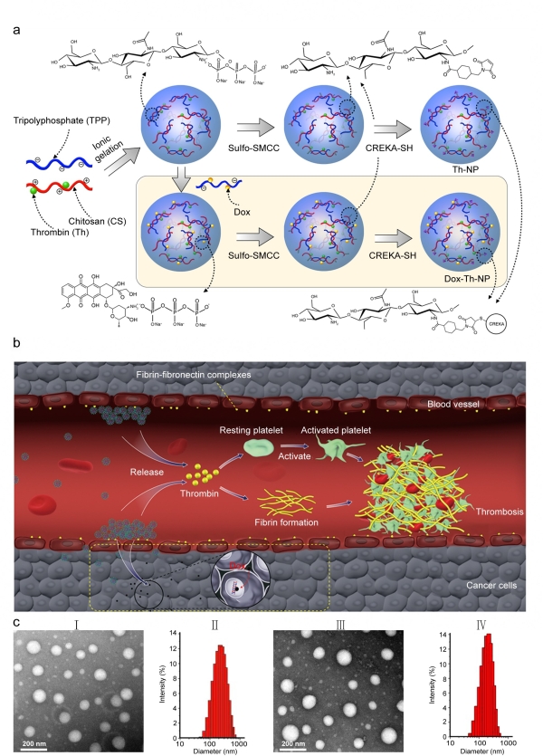 圖 1. 負載促凝因子凝血酶和化療藥物的納米載體設計及工作機理