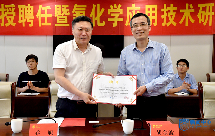黨委教師工作部常務(wù)副部長、人才資源部副部長秦衛(wèi)明詳細(xì)介紹了胡金波教授的科研經(jīng)歷及其在有機(jī)氟化學(xué)和氟材料領(lǐng)域所取得的卓越學(xué)術(shù)成就。在熱烈的掌聲中,喬旭校長為胡金波教授頒發(fā)了名譽(yù)教授聘書,學(xué)生代表為胡教授佩戴?;詹I(xiàn)上鮮花。