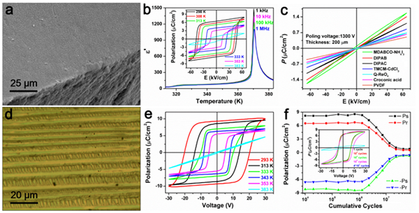 圖2(a)粉末壓片SEM圖;(b)介電溫度依賴性,插圖為粉末壓片測得的P-E電滯回線;(c)相同電場下,部分典型分子鐵電體粉末壓片狀態(tài)的P-E關(guān)系,(d)薄膜光學(xué)顯微鏡照片;(e)薄膜P-E電滯回線;(f)鐵電薄膜疲勞特性