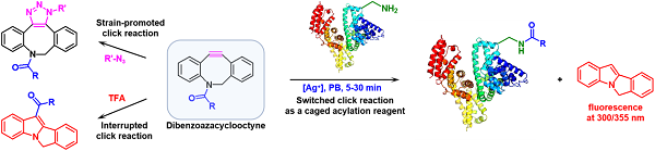 上海藥物所黃蔚研究員和楊偉波研究員合作,發(fā)現(xiàn)環(huán)張力炔基DBCO結構可以在酸性條件下重排喪失其點擊化學反應活性。通過研究進一步發(fā)現(xiàn),銀試劑AgNTf2或AgOAc可以在中性條件下促進DBCO快速重排生成四環(huán)產物,并且當反應體系有胺類化合物時,會發(fā)生轉酰胺反應,形成新的酰胺產物。在此過程中,銀試劑催化轉酰胺反應具有“籠縛”?;噭傩裕簾o催化劑條件下其酰化活性“束縛”在DBCO“籠狀”結構中,而在銀催化下從“籠”中釋放其酰化能力。在與疊氮基團的競爭反應中,銀試劑催化轉酰胺反應效率遠高于疊氮點擊化學反應,?;a物產率高達95%。