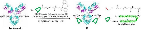 圖3:DBCO標記的Fc靶向肽應用于曲妥珠單抗上K249的定點偶聯(lián)