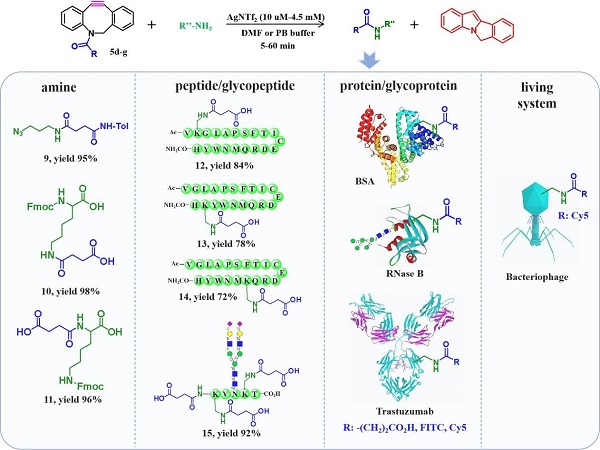 圖2:銀催化DBCO轉酰胺反應的底物適應性。DBCO結構包含Succinyl-DBCO、FITC-DBCO、Cy5-DBCO等;氨基底物包含氨基酸、多肽、糖肽、蛋白、糖蛋白和噬菌體。