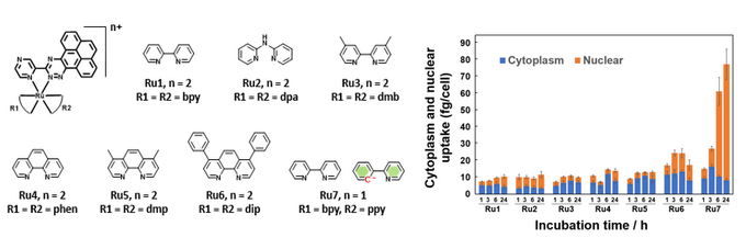 圖2. 釕(II)配合物細胞攝取及細胞核靶向性