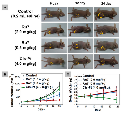 抗腫瘤實驗表明Ru7能誘導腫瘤細胞發(fā)生壞死性凋亡。細胞信號通路研究證實Ru7通過抑制Topo I/II活性、誘導DNA損傷、激活DNA修復酶PARP-1及下游RIPK1-RIPK3-MLKL壞死性凋亡核心通路,從而有效地克服腫瘤耐藥(圖3)。該研究首次揭示了釕(II)配合物通過抑制拓撲異構(gòu)酶,誘導腫瘤細胞壞死性凋亡之間的內(nèi)在聯(lián)系。作者進一步開展了小鼠耐藥腫瘤模型測試,評估誘導腫瘤細胞壞死性凋亡的金屬配合物活體抗腫瘤效果。實驗結(jié)果表明,經(jīng)過4天1次腹腔注射給藥,連續(xù)24天治療后,Ru7在裸鼠耐藥腫瘤模型中表現(xiàn)出非常優(yōu)異的抗腫瘤活性;荷瘤鼠主要組織器官的切片染色觀察表明Ru7并沒有造成明顯的組織損傷或病變,同時給藥組的裸鼠也沒有出現(xiàn)體重下降或行為異常的情況(圖3)。