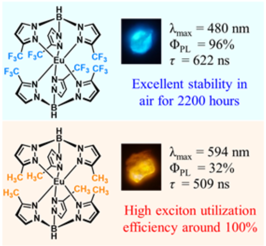 北京大學(xué)化學(xué)與分子工程學(xué)院黃春輝課題組劉志偉副教授等另辟蹊徑,提出并證明了具有d-f允許躍遷特性的稀土Eu(II)配合物可以通過(guò)合理的分子結(jié)構(gòu)設(shè)計(jì)實(shí)現(xiàn)高空氣/熱穩(wěn)定性和高發(fā)光效率,以及這類材料應(yīng)用于OLEDs時(shí)具有接近100%的激子利用率和高亮度下較低的效率衰減。