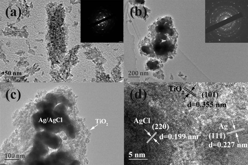 圖1 制備樣品的TEM照片: (a) Ti3+-TiO2介晶; (b-d) Ag/AgCl@Ti3+-TiO2復(fù)合材料