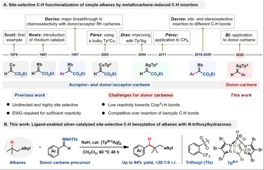 烷烴是大宗的石油化工產(chǎn)品,其合成利用具有極高的研究價值,然而,由于烷烴碳氫鍵(Csp3?H)的內(nèi)在惰性及各種Csp3?H鍵的鍵能差異小,導(dǎo)致反應(yīng)不發(fā)生或者選擇性差,因此,簡單烷烴C?H鍵的精準轉(zhuǎn)化是石油化工產(chǎn)業(yè)獲得重大突破的瓶頸問題,也是當前合成化學最具挑戰(zhàn)性的課題之一。多年來,畢錫和課題組致力于銀催化有機合成與理論研究,取得了一系列創(chuàng)新性研究結(jié)果,成為銀催化領(lǐng)域的重要推動者(Acc. Chem. Res. 2020, 53, 662)。近期,他們在銀催化烷烴的區(qū)域選擇性官能化方向取得了新突破,解決了donor型金屬卡賓難以與烷烴發(fā)生分子間反應(yīng)的問題,成功利用銀催化實現(xiàn)了磺酰腙作為重氮前體與烷烴3o C?H鍵的選擇性插入反應(yīng)。這一研究具有如下特點:這是首例donor型金屬卡賓對烷烴Csp3?H鍵的分子間選擇性插入反應(yīng),解決了donor型卡賓反應(yīng)活性低、難以與烷烴反應(yīng)的問題;無需引入導(dǎo)向基團,對3o C?H具有高選擇性;弱配體提高了銀卡賓反應(yīng)活性并抑制了重氮化合物二聚,為后續(xù)研究提供了理論指導(dǎo);銀催化劑用量低,反應(yīng)操作簡單、安全高效,能夠克級規(guī)模合成,具有應(yīng)用前景。