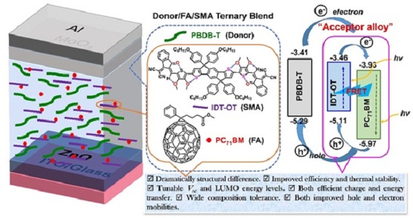 該論文通過引入新型小分子受體材料IDT-OT構(gòu)筑了高效三元聚合物太陽能電池,研究表明,小分子受體和富勒烯類受體間形成的合金是該三元體系的光伏性能和熱穩(wěn)定性提高的根本原因。研究證實(shí),該受體合金之間同時存在能量轉(zhuǎn)移和電荷轉(zhuǎn)移,其工作機(jī)理目前文獻(xiàn)罕見報道。論文第一作者碩士研究生尹攀,通訊作者是沈平教授。