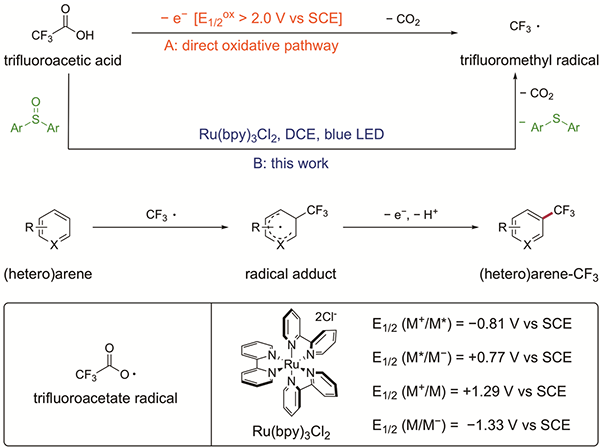 導(dǎo)讀:中國科學(xué)院上海有機(jī)化學(xué)研究所天然產(chǎn)物有機(jī)合成化學(xué)重點(diǎn)實(shí)驗(yàn)室金健課題組近期在芳烴的三氟甲基化研究中取得新進(jìn)展(圖1)。光氧化還原催化與芳基亞砜的結(jié)合,為三氟甲基自由基以及類似自由基的產(chǎn)生提供了新的途徑(Cell Reports Physical Science 2020, DOI: 10.1016/j.xcrp.2020.100141)。
