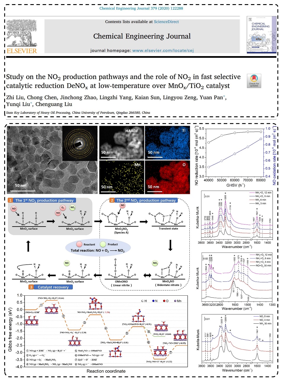 題目為《MnOx/TiO2催化劑上NO2生成路徑及NO2在低溫下快速SCR脫硝反應(yīng)中的作用機理研究》(Study on the NO2production pathways and the role of NO2in fast selective catalytic reduction DeNOxat low-temperature over MnOx/TiO2catalyst)的研究論文發(fā)表在化工領(lǐng)域權(quán)威期刊Chemical Engineering Journal上(Chemical Engineering Journal2020, 379, 122288)。研究人員發(fā)現(xiàn)低溫NH3-SCR反應(yīng)(NH3+NO+O2→N2+H2O)是NO氧化反應(yīng)(NO+O2→NO2)與“快速SCR”反應(yīng)(NH3+NO+NO2→N2+H2O)耦合的結(jié)果,NO氧化反應(yīng)是整個低溫NH3-SCR過程的控速反應(yīng)。結(jié)合原位紅外和密度泛函理論計算等手段,發(fā)現(xiàn)了一種新型二齒硝酸鹽中間產(chǎn)物(*MnO2NO2),并提出了完整的NO催化氧化路徑。該工作為后續(xù)高效低溫NH3-SCR催化劑的設(shè)計合成提供了重要思路及理論基礎(chǔ)。