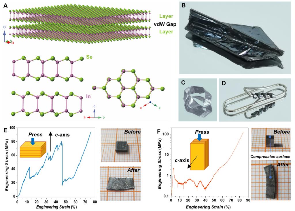 該研究發(fā)現(xiàn),不同于多晶形態(tài)下的脆性行為,InSe單晶二維材料在塊體形態(tài)下可以彎折、扭曲而不破碎,甚至能夠折成“紙飛機”、彎成莫比烏斯環(huán),表現(xiàn)出罕見的大變形能力。非標(biāo)力學(xué)試驗結(jié)果進(jìn)一步證實了材料的超常塑性,其壓縮工程應(yīng)變可達(dá)80%,特定方向的彎曲和拉伸工程應(yīng)變也高于10%。