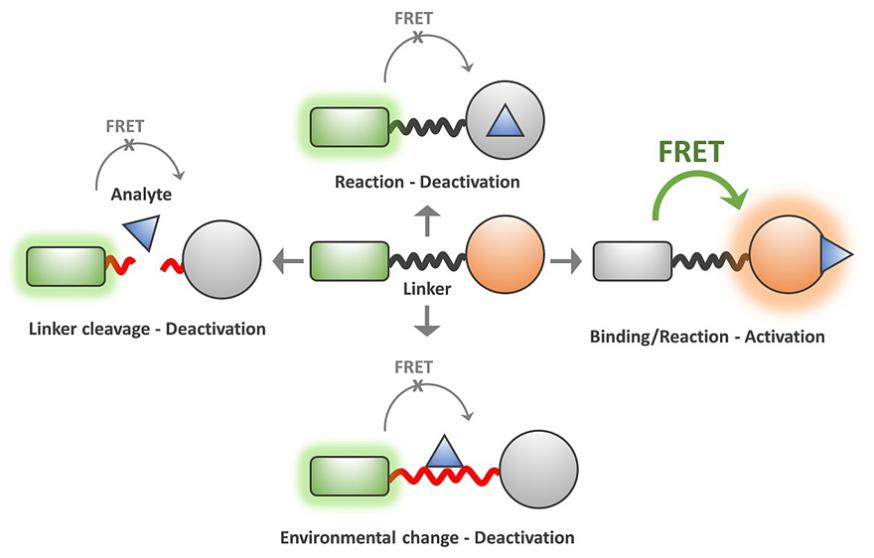 F?rster 共振能量轉移(F?rster resonance energy transfer, FRET)是根據理論物理學家Theodor F?rster命名,其在1948年提出了關于從能量供體到受體的電子激發(fā)轉移效率的方程式。FRET是通過供體-受體之間長程偶極-偶極作用的一種非輻射能量轉移過程。在光激發(fā)下,電子激發(fā)態(tài)的供體能量能被轉移到基態(tài)的受體。當供體和受體都是熒光團時,FRET經常被稱作“fluorescence resonance energy transfer”,即熒光共振能量轉移。