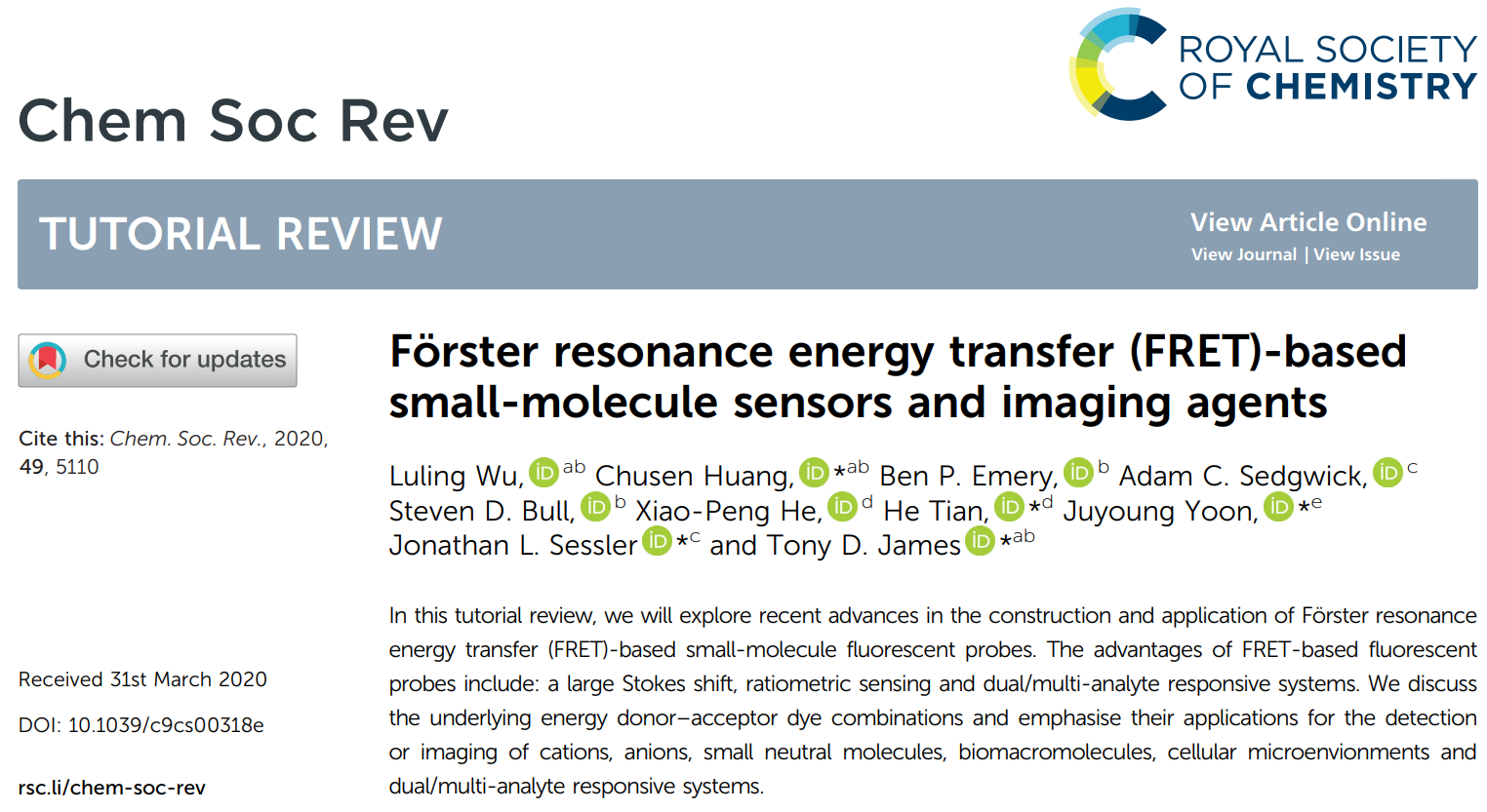 Chem.Soc.Rev.封面!上海師大黃楚森副教授FRET原理設計的小分子熒光探針的最新研究進展