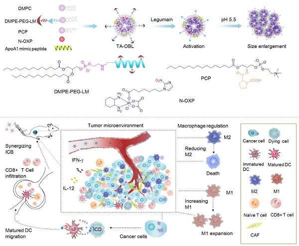 該研究設(shè)計(jì)合成了ICD誘導(dǎo)劑奧沙利鉑的功能性前藥(N-OXP)、胞內(nèi)微酸響應(yīng)磷脂衍生物(PCP)以及Legumain酶響應(yīng)的蜂毒前肽衍生物(DMPE-PEG-LM),并將其構(gòu)建為腫瘤激活的仿生脂蛋白載藥系統(tǒng)(TA-OBL)。研究發(fā)現(xiàn)TA-OBL能夠高效蓄積在腫瘤部位并滲透進(jìn)入腫瘤深部區(qū)域,到達(dá)腫瘤細(xì)胞并誘導(dǎo)ICD,增強(qiáng)腫瘤免疫原性,使瘤內(nèi)殺傷性T細(xì)胞比例提高4倍,免疫抑制性M2巨噬細(xì)胞降低了77%,并顯著提高了瘤內(nèi)免疫殺傷因子(IFN-γ、IL-12)的水平。在乳腺癌4T1、結(jié)腸癌CT-26等腫瘤模型中,TA-OBL與anti-PD-1、anti-CD47等ICB協(xié)同增效,顯著抑制了腫瘤的生長并延長了荷瘤小鼠的生存期。因此,該研究為利用納米載體系統(tǒng)提高瘤內(nèi)藥物遞送提供了一種有效遞送策略,并為增強(qiáng)抗腫瘤免疫應(yīng)答提高ICB治療效果提供了一種有意義的探索。