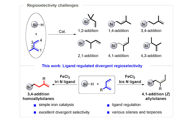 陳慶安團(tuán)隊(duì)一直致力于異戊二烯的區(qū)域選擇性調(diào)控(Angew. Chem. Int. Ed. 2019, 58, 5438;Chem. Sci. 2019, 10, 9560;Chin. J. Catal. 2020, 41, 1401)。該團(tuán)隊(duì)在前期“金屬—?dú)洹闭{(diào)控的基礎(chǔ)上,最近又發(fā)展了一種新穎的“配體調(diào)控”策略:以廉價(jià)二價(jià)鐵為活性催化劑中心,圍繞調(diào)控其配位環(huán)境為核心思想,分別設(shè)計(jì)了三齒和雙齒吡啶亞胺類配體。他們發(fā)現(xiàn),三齒配體可以促進(jìn)硅氫化反應(yīng)在異戊二烯的3,4位進(jìn)行,得到高烯丙基硅化合物;而雙齒配體則使得區(qū)域選擇性變?yōu)?,1-加成,得到烯丙基硅化合物。該工作對(duì)于通過調(diào)控金屬配位環(huán)境來改變選擇性有很好的借鑒作用。