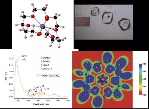 在科工局“長壽命核素分離與化學行為”科學挑戰(zhàn)專題、基金委化學部“乏燃料后處理復雜體系中的錒系元素化學研究”重大項目和基金委杰出青年基金等的支持下,蘇州大學放射醫(yī)學與輻射防護國家重點實驗室王殳凹、清華大學化學系李雋和中國工程物理研究院的汪小琳合作開展了國內(nèi)第一例钚的實驗配位化學及理論研究,發(fā)現(xiàn)了利用孔穴效應和位阻效應在氧化還原過程中形成穩(wěn)定的钚非常規(guī)價態(tài)的方法,獲得了國內(nèi)首個钚化合物的晶體結(jié)構(gòu),并首次通過放射性實驗獲得了固體中五價钚的電子躍遷譜(圖1)。這是國際上制備的首例钚的冠醚類化合物。