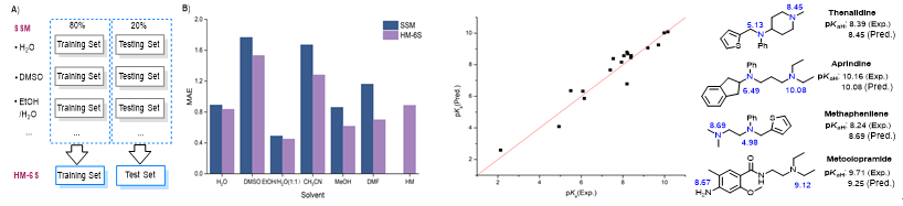 iBond數(shù)據(jù)庫(kù)是由清華大學(xué)程津培院士領(lǐng)銜創(chuàng)建的全球最權(quán)威的鍵能數(shù)據(jù)庫(kù),其收集了文獻(xiàn)報(bào)道的兩萬余種化合物的約三萬五千個(gè)準(zhǔn)確pKa數(shù)據(jù)。研究團(tuán)隊(duì)對(duì)iBond數(shù)據(jù)庫(kù)中已有數(shù)據(jù)進(jìn)行了系統(tǒng)整理標(biāo)記,形成了種類豐富、溶劑分布廣泛、數(shù)據(jù)分布合理的數(shù)據(jù)集。在自此基礎(chǔ)上,團(tuán)隊(duì)引入了結(jié)合化合物結(jié)構(gòu)特征和物理化學(xué)性質(zhì)的SPOC描述符對(duì)化合物進(jìn)行精確描述,并采用當(dāng)前流行的XGBoost和神經(jīng)網(wǎng)絡(luò)算法構(gòu)建了高精度預(yù)測(cè)模型。該預(yù)測(cè)模型可以實(shí)現(xiàn)不同溶劑中化合物pKa的同時(shí)預(yù)測(cè),并能夠?qū)Π∣-H、N-H、C-H在內(nèi)的各種不同酸性氫進(jìn)行準(zhǔn)確的pKa預(yù)測(cè),精度可達(dá)到0.87pK單位。團(tuán)隊(duì)分別選擇了若干藥物分子和小分子催化劑對(duì)水相及有機(jī)相的預(yù)測(cè)能力進(jìn)行了測(cè)試,研究表明對(duì)藥物分子的水相pKa預(yù)測(cè)的平均誤差可低至0.44,對(duì)有機(jī)小分子有機(jī)相pKa預(yù)測(cè)的平均誤差則在1 pK單位左右。