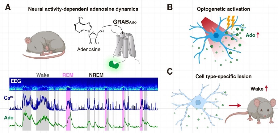 睡眠是動物界普遍存在的現(xiàn)象,人類大約有三分之一的時間用于睡眠。然而睡眠是如何被調(diào)節(jié)的目前尚不清楚。經(jīng)典的睡眠調(diào)控模型認(rèn)為,睡眠的調(diào)節(jié)分為兩個方面,晝夜節(jié)律和睡眠穩(wěn)態(tài)。晝夜節(jié)律通過內(nèi)在的生物鐘控制一天中睡眠覺醒的時間;睡眠穩(wěn)態(tài)主要由睡眠壓力進行調(diào)控,控制機體獲得一定的睡眠量。隨著清醒時間的延長,睡眠壓力逐漸增加;隨著睡眠的進行,睡眠壓力被逐漸清除。睡眠穩(wěn)態(tài)調(diào)節(jié)系統(tǒng)會在睡眠受到干擾時發(fā)揮作用,例如:熬夜之后睡得更“香”并且時間更長。目前,主流理論認(rèn)為“腺苷”參與到睡眠穩(wěn)態(tài)調(diào)節(jié)過程中,其在清醒狀態(tài)下的積累導(dǎo)致了“困意”的產(chǎn)生,而咖啡的主要成分咖啡因可以通過阻斷腺苷與其受體的結(jié)合而達到促進清醒的效果。基底前腦被認(rèn)為是腺苷參與睡眠穩(wěn)態(tài)調(diào)控的重要腦區(qū),環(huán)路層面的研究表明,該區(qū)域的局部神經(jīng)環(huán)路參與到對睡眠覺醒的調(diào)控中,然而神經(jīng)元活動調(diào)控腺苷釋放的機制目前還不清楚。這限制了人們對睡眠覺醒調(diào)控機制的深入解析。