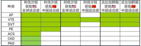表1 新一代口服抗凝藥物獲批適應(yīng)癥比較