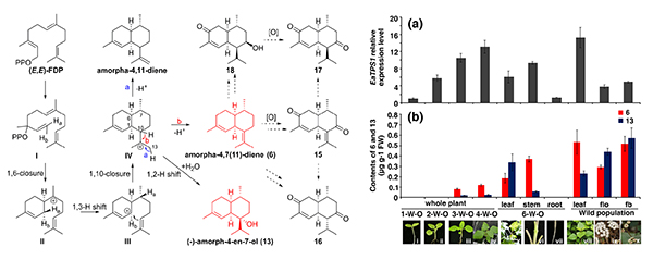 紫莖澤蘭(Eupatorium adenophorum Spreng)在我國是一種嚴(yán)重的外來入侵植物,具有強(qiáng)大的化學(xué)防御系統(tǒng),但其防御物質(zhì)及生物合成機(jī)制尚屬未知。近期,中國科學(xué)院昆明植物研究所活性天然產(chǎn)物發(fā)現(xiàn)與生物合成團(tuán)隊黎勝紅研究組綜合運用植物化學(xué)、分子生物學(xué)、生物化學(xué)、合成生物學(xué)等技術(shù),揭示了紫莖澤蘭中杜松烯類倍半萜的體內(nèi)外抗蟲防御功能,解析了其生物合成途徑的關(guān)鍵步驟,并構(gòu)建了杜松烯類天然產(chǎn)物的異源合成通路。經(jīng)各種誘導(dǎo)處理以及代謝分析發(fā)現(xiàn),6個杜松烯類倍半萜是紫莖澤蘭的主要組成型和誘導(dǎo)型防御物質(zhì),這些化合物均表現(xiàn)出顯著的昆蟲拒食活性。在此基礎(chǔ)上,對杜松烯類倍半萜的生物合成開展了研究,從紫莖澤蘭中克隆并功能鑒定了3個倍半萜合酶基因,包括一個新穎的倍半萜合酶EaTPS1,能夠催化其中2個關(guān)鍵中間體amorpha-4,7(11)-diene 和 (–)-amorph-4-en-7-ol的合成。在大腸桿菌中構(gòu)建了這兩個化合物的從頭合成通路,從10 L搖瓶培養(yǎng)液中分離純化了550 mg的amorpha-4,7(11)-diene和35 mg的(–)-amorph-4-en-7-ol單體化合物,并通過1D和2D NMR等波譜技術(shù)確證了其結(jié)構(gòu)。通過基因表達(dá)模式和化合物積累的相關(guān)性分析,證實了EaTPS1在紫莖澤蘭中參與杜松烯類倍半萜的生物合成,并發(fā)現(xiàn)機(jī)械損傷和MeJA處理降低EaTPS1基因的表達(dá)但能促進(jìn)化合物的釋放。在煙草中瞬時表達(dá)EaTPS1基因,發(fā)現(xiàn)轉(zhuǎn)基因煙草也能合成amorpha-4,7(11)-diene 和 (–)-amorph-4-en-7-ol,同時抗蟲防御功能也得到提高,進(jìn)一步證實了EaTPS1在植物體內(nèi)的功能。該研究首次揭示了紫莖澤蘭的化學(xué)防御物質(zhì)及其形成機(jī)制,并實現(xiàn)了杜松烯類倍半萜的異源合成,為該類天然產(chǎn)物的生物活性和合成生物學(xué)深入研究奠定了重要基礎(chǔ)。