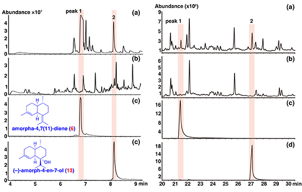 圖2 工程大腸桿菌(左圖)和本氏煙草(右圖)異源合成amorpha-4,7(11)-diene 和 (–)-amorph-4-en-7-ol