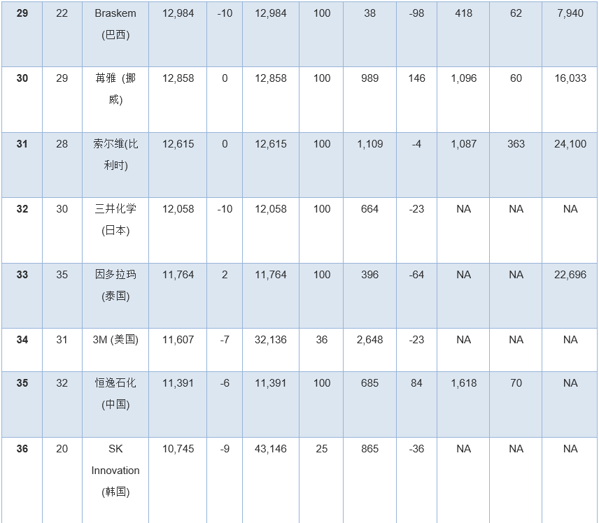 榜單中前五名之外,并購活動繼續(xù)影響排行榜。重組后杜邦公司在榜單上排名第13位,而陶氏杜邦公司(DowDuPont)農化業(yè)務剝離成立的科迪華公司(Corteva)首度排名第25位。而都有大量農化業(yè)務的拜耳和中國化工排名都高于科迪華公司,中國化工在榜單中居第八,拜耳位居第十二名。2019年也是林德與普萊克斯合并后的第一個全年業(yè)績,新林德公司在排行榜中排名第十,而工業(yè)氣體競爭對手液空集團(Air Liquide)排名第十一位。