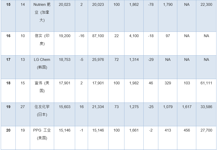 此外,幾家擁有大量化學品業(yè)務的公司因為沒有全面公開報告化學品收入,所以未能參加本年度排行榜。其中包括英力士、科赫工業(yè)、殼牌、道達爾和中國石油(PetroChina)。