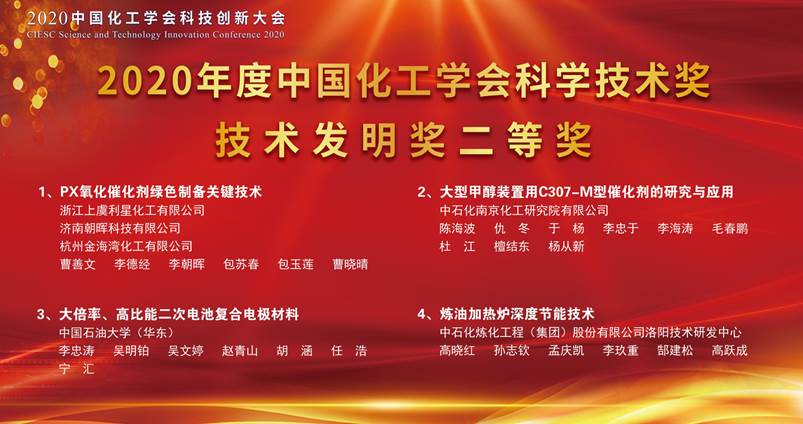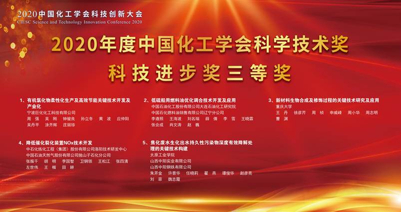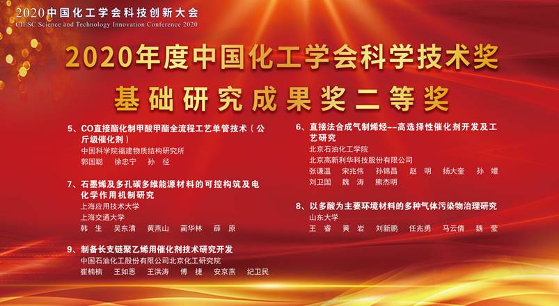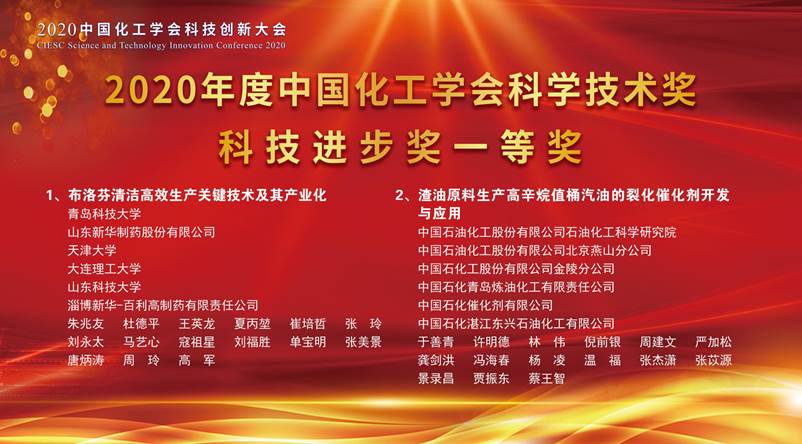 9月15日,在北京召開的2020中國(guó)化工學(xué)會(huì)科技創(chuàng)新大會(huì)上,2020年度中國(guó)化工學(xué)會(huì)科學(xué)技術(shù)獎(jiǎng)隆重頒發(fā)。35項(xiàng)優(yōu)秀科學(xué)技術(shù)獲得獎(jiǎng)項(xiàng),其中青島科技大學(xué)“布洛芬清潔高效生產(chǎn)關(guān)鍵技術(shù)及其產(chǎn)業(yè)化”等12項(xiàng)成果獲得“科技進(jìn)步獎(jiǎng)”,中國(guó)石化上海石油化工研究院“超薄層狀分子篩材料創(chuàng)制及低苯烯比乙苯催化劑工業(yè)應(yīng)用”等6項(xiàng)成果獲得“技術(shù)發(fā)明獎(jiǎng)”,中國(guó)石油大學(xué)(北京)“機(jī)動(dòng)車尾氣排放PM2.5高效催化凈化技術(shù)”等17項(xiàng)成果獲得“基礎(chǔ)研究成果獎(jiǎng)”。