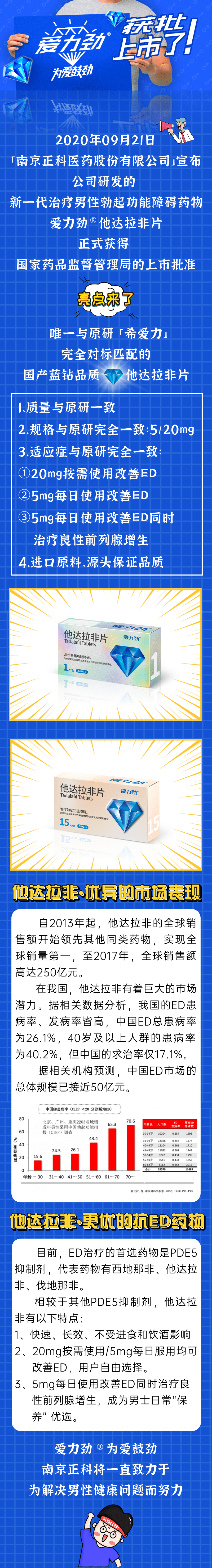 導讀:重磅消息 南京正科「愛力勁?他達拉非片」獲批上市!