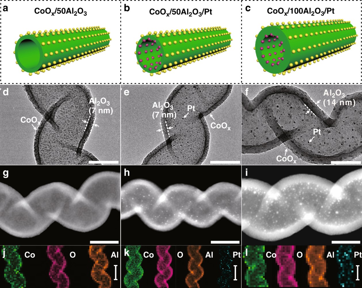 圖1. 催化劑CoOx/50Al2O3、CoOx/50Al2O3/Pt和CoOx/100Al2O3/Pt的結構示意圖(a-c),TEM圖(d-f),高角環(huán)形暗場STEM圖(g-i)及EDX元素分布圖(j-l)