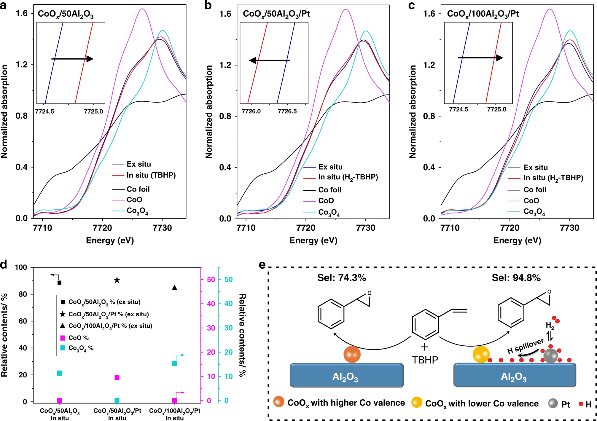 為了揭示選擇性增強的機制,進行了一系列的實驗和表征。結果表明,催化劑中Pt和CoOx的粒徑(TEM 和XRD),催化劑孔結構(N2吸脫附),反應中自由基的種類(EPR),氧化劑的濃度(改變TBHP/苯乙烯比例)等不是選擇性提高的原因。進一步利用XAFS技術對催化劑反應前和反應中鈷的電子狀態(tài)進行表征(圖2a-c)。對于CoOx/50Al2O3/Pt在H2-TBHP條件下,催化劑中的鈷物種被部分還原到較低價態(tài)(CoO)。而對于CoOx/50Al2O3在TBHP條件及CoOx/100Al2O3/Pt在H2-TBHP條件下,催化劑中的鈷物種被部分氧化為Co3O4。催化劑XANES原位譜的線性擬合結果(圖2d)與該結論一致。以上分析結果表明,當環(huán)氧化反應中引入可控氫溢流時,反應中鈷物種處于更低的價態(tài),導致了顯著提高的催化選擇性(圖2e)。該方法具有普適性,有望進一步應用到其他反應中。