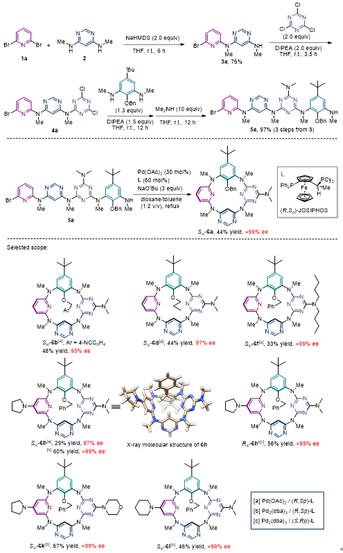 首先,他們?cè)O(shè)計(jì)并高效合成了一系列氮原子連接的含有不同氮原子數(shù)目的芳(雜)環(huán)如苯環(huán)、吡啶、嘧啶和三嗪的ABCD型線性四聚體分子,并通過(guò)分子內(nèi)鈀催化的Buchwald-Hartwig C-N鍵偶聯(lián)反應(yīng),制備了固有手性分子的外消旋體。進(jìn)而,他們探究了手性配體存在條件下的反應(yīng),發(fā)現(xiàn)僅運(yùn)用在小分子反應(yīng)中很常見的Pd(OAc)2/(R,Sp)-JOSIPHOS催化體系,鏈狀分子5就能夠順利的發(fā)生分子內(nèi)交叉偶聯(lián)反應(yīng),即手性催化劑能誘導(dǎo)氧化加成和轉(zhuǎn)金屬化步驟,生成含固有手性的大環(huán)中間體,再經(jīng)還原消除形成C-N鍵,以>99%的ee值生成ABCD型固有手性大環(huán)分子。該方法底物適用性廣,可方便的在ABCD任意環(huán)上改換不同的官能團(tuán),匯聚式地實(shí)現(xiàn)了結(jié)構(gòu)豐富多樣的固有手性大環(huán)分子的快速高效構(gòu)建(圖二)。