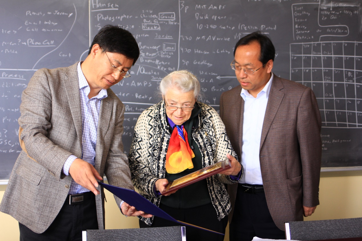 劉忠范(左)、張錦(右)與世界碳材料之母Mildred S. Dresselhaus教授在一起