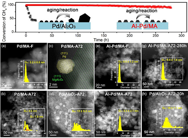 甲烷催化燃燒因在潔凈能源轉(zhuǎn)化與利用及環(huán)境保護方面的重要應(yīng)用而受到廣泛關(guān)注。負載Pd催化劑在該反應(yīng)中具有優(yōu)異的催化活性,但該催化劑實際使用過程中經(jīng)常面臨高濕反應(yīng)氣體以及高溫反應(yīng)條件,導(dǎo)致Pd納米顆粒燒結(jié)長大,降低催化劑性能。因此開發(fā)具有高活性、高水熱穩(wěn)定性的甲烷催化燃燒材料極具挑戰(zhàn)。該團隊長期致力于高熱穩(wěn)定貴金屬納米顆粒催化劑的制備,在前期研究中發(fā)現(xiàn)Pt和Au納米顆粒與界面匹配的尖晶石可以形成外延結(jié)構(gòu),使負載的Pt和Au納米顆??梢越?jīng)受800-1200°C的高溫而不明顯長大(Nat. Commun., 2013;Nano Lett., 2018)。Pd與Pt具有相近的晶格常數(shù),理論上可以采用相同策略提高負載Pd催化劑的熱穩(wěn)定性。然而,由于Pd納米顆粒在空氣中極易被氧化,導(dǎo)致金屬—載體界面的失配度增加,從而失去抗燒結(jié)的能力。