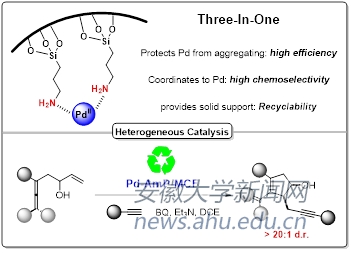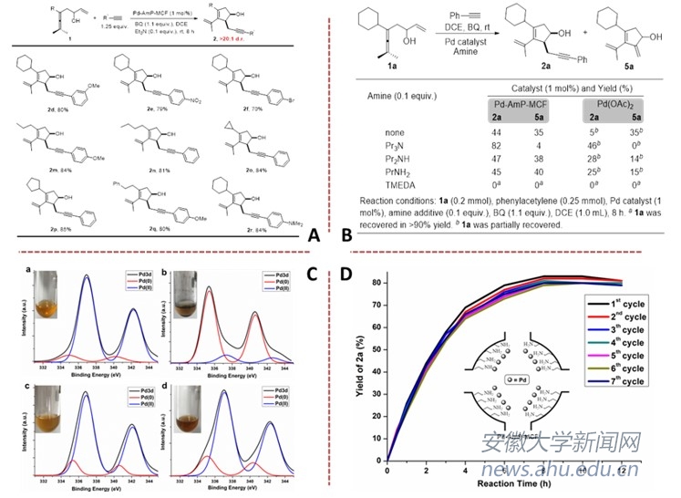 鈀催化的C(sp3)-H鍵氧化官能團(tuán)化是惰性C-H鍵定向轉(zhuǎn)化的有力手段。但是,均相體系下催化劑的失活導(dǎo)致鈀的用量通常較大(> 5 mol%)。李漫波教授與斯德哥爾摩大學(xué)Jan-E. B?ckvall教授合作,發(fā)現(xiàn)氨基化的多孔硅(MCF)負(fù)載的納米鈀(尺寸1~2nm)催化劑Pd-AmP-MCF能顯著降低鈀催化氧化過程中的催化劑用量(< 1 mol%),同時(shí)還能實(shí)現(xiàn)催化劑的循環(huán)利用。(J. Am. Chem. Soc., 2018, 140, 14604;Angew. Chem. Int. Ed., 2020, 59, 1992;Angew. Chem. Int. Ed., 2020, 59, 10391;Chem. ?Eur. J., 2019, 24, 210)。在此工作的基礎(chǔ)上,近期李漫波教授課題組發(fā)現(xiàn)了氨基還能很好地調(diào)控納米鈀顆粒催化氧化的化學(xué)選擇性(圖2A)。反應(yīng)的選擇性來源于氨基與鈀之間的配位作用(圖2B)。Pd-AmP-MCF的高催化活性來源于氨基化的多孔硅材料(AmP-MCF)對(duì)鈀的支撐和保護(hù),使其避免了催化劑的失活(圖2C)。與此同時(shí),該非均相催化劑在反應(yīng)后具有優(yōu)異的循環(huán)回收效率(圖2D)。