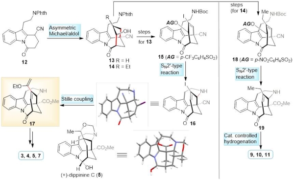 中國(guó)科學(xué)院長(zhǎng)春應(yīng)用化學(xué)研究所所韓福社課題組在報(bào)道了Dippinine-Chippiine同系天然產(chǎn)物(+)-Tronocarpine(圖一,1)的首次不對(duì)稱全合成及其絕對(duì)構(gòu)型確定后(Angew.Chem.Int.Ed.,F(xiàn)rontispiece cover;Tetrahedron),最近在該領(lǐng)域的研究中再次取得重要進(jìn)展。他們?cè)O(shè)計(jì)并發(fā)展了以吲哚-內(nèi)酰胺衍生物12(圖二)與丙烯醛衍生物的不對(duì)稱Michael/aldol串聯(lián)反應(yīng)構(gòu)建手性氮雜[3.3.1]橋環(huán)骨架衍生物(13和14)、分子內(nèi)氮雜SN2’反應(yīng)構(gòu)建含氮七元雜環(huán)(15→16;18→19)、Stille偶聯(lián)引入[3.3.1]橋環(huán)側(cè)基官能團(tuán)(16→17)及催化劑控制的立體選擇性氫化(19→9–11)等為關(guān)鍵反應(yīng)的發(fā)散式合成路線策略,成功實(shí)現(xiàn)了系列依波加次級(jí)代謝天然產(chǎn)物dippinine B(4)和C(5),10,11-demethoxychippiine(9),3-O-methyl-10,11-demethoxychippiine(10)、3-hydroxy-3,4-secocoronaridine(11)五個(gè)天然產(chǎn)物的首次不對(duì)稱多樣性全合成,以及C11位脫甲氧基demethoxydippinine A(3)和demethoxydippinine D(7)兩個(gè)類似物的不對(duì)稱合成。該工作所發(fā)展建立的合成新策略和方法對(duì)該家族中其它天然產(chǎn)物的合成具有重要參考價(jià)值,對(duì)于深入開(kāi)展此類天然產(chǎn)物及其類似物生物活性研究奠定了重要基礎(chǔ)。