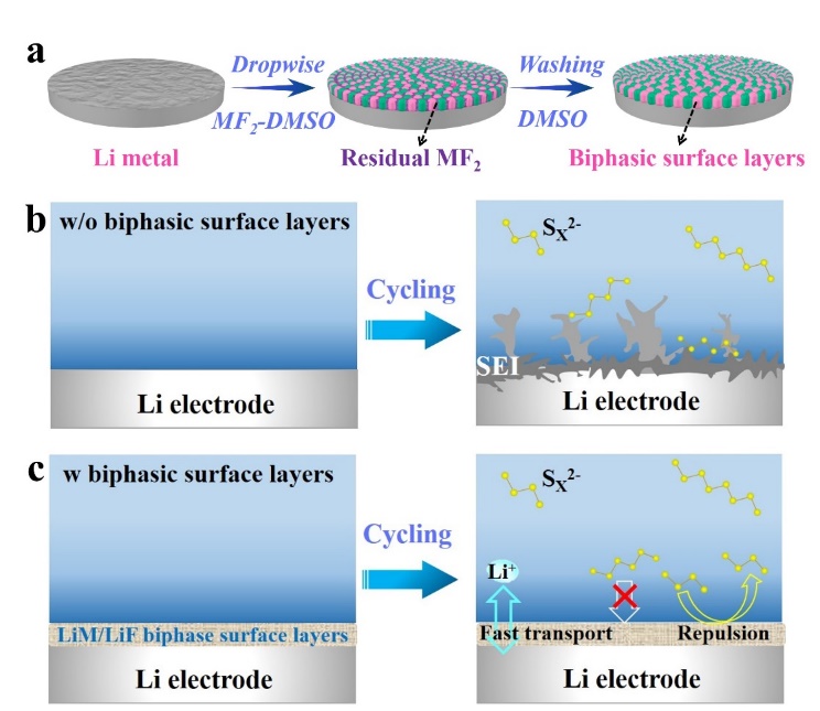 圖 (a) 堅(jiān)固的雙相表面層構(gòu)造過(guò)程的示意圖;(b) 鋰硫電池中多硫化物穿梭引起的鋰金屬腐蝕的機(jī)理;(c) 堅(jiān)固的雙相表面層抑制多硫化物穿梭的機(jī)制。