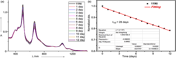 圖2. (a)化合物11Ni的紫外可見吸收光譜隨時間變化譜圖;(b)化合物11Ni在502 nm處的吸光度隨時間變化的曲線和半衰期估值約為28天。