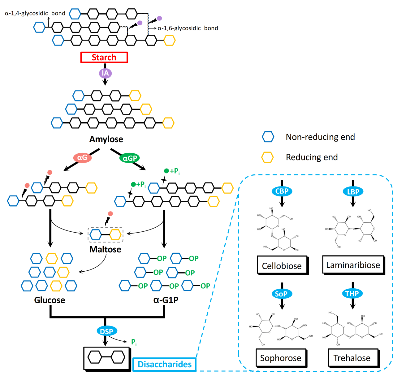 中國(guó)科學(xué)院天津工業(yè)生物技術(shù)研究所游淳研究員帶領(lǐng)的體外合成生物學(xué)中心研究團(tuán)隊(duì),設(shè)計(jì)了將廉價(jià)底物淀粉轉(zhuǎn)化為多種功能性二糖的體外多酶催化體系。在該體系中,α-葡聚糖磷酸化酶(α-glucan phosphorylase, αGP)和α-葡萄糖苷酶(α-glucosidase, αG)兩種酶并行工作,將淀粉分別轉(zhuǎn)化為葡萄糖1-磷酸和葡萄糖,隨后葡萄糖1-磷酸和葡萄糖經(jīng)不同的二糖磷酸化酶 (disaccharide phosphorylase, DSP)催化合成各種功能性二糖。該工作利用動(dòng)力學(xué)數(shù)學(xué)模型對(duì)體外多酶催化體系的反應(yīng)進(jìn)程進(jìn)行學(xué)習(xí)并預(yù)測(cè)最佳反應(yīng)條件,最終以淀粉為單一底物成功地制備了昆布二糖、纖維二糖、海藻糖、槐糖等各種功能性二糖,產(chǎn)率均在80%以上。該研究中功能性二糖的生產(chǎn)方式顛覆了現(xiàn)有二糖的傳統(tǒng)生產(chǎn)模式,具有較大的工業(yè)應(yīng)用潛力。