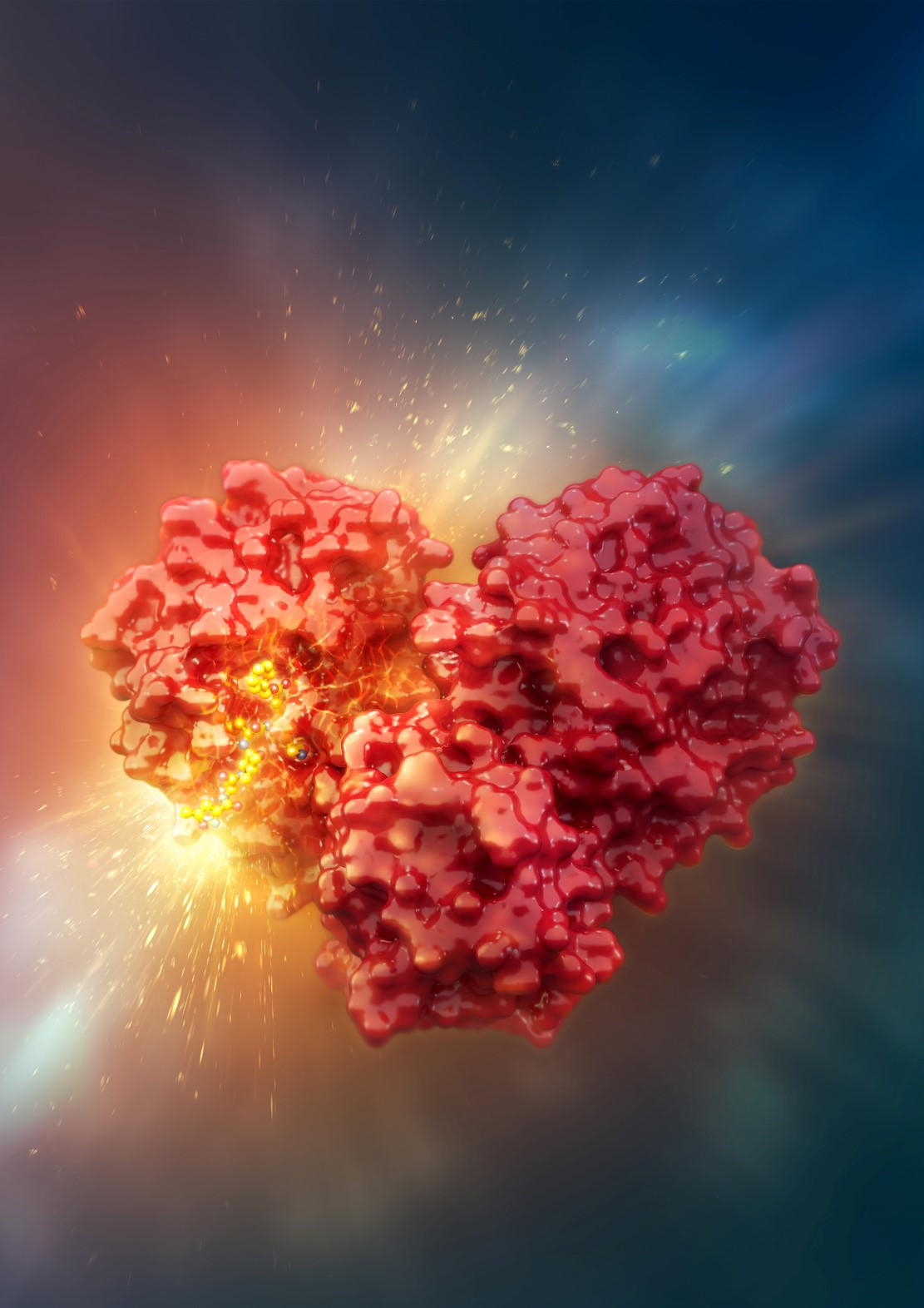 新冠病毒主蛋白酶(紅色)與抑制劑(黃色)的復(fù)合物結(jié)構(gòu)