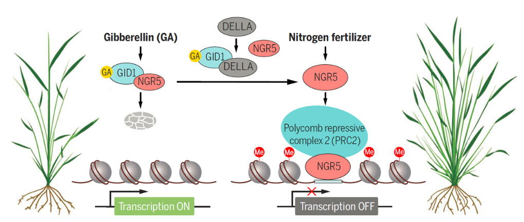 面向國(guó)家糧食安全和農(nóng)業(yè)可持續(xù)發(fā)展的重大戰(zhàn)略需求,中國(guó)科學(xué)院遺傳與發(fā)育生物學(xué)研究所傅向東研究團(tuán)隊(duì)在水稻高產(chǎn)和氮高效協(xié)同調(diào)控機(jī)制領(lǐng)域獲得重要突破。研究發(fā)現(xiàn)了赤霉素信號(hào)轉(zhuǎn)導(dǎo)途徑新組分NGR5通過(guò)介導(dǎo)組蛋白甲基化修飾來(lái)調(diào)控植物響應(yīng)土壤氮素水平的變化,同時(shí)與生長(zhǎng)阻遏因子DELLA蛋白競(jìng)爭(zhēng)性結(jié)合赤霉素受體GID1,實(shí)現(xiàn)赤霉素調(diào)控植物生長(zhǎng)發(fā)育。在高產(chǎn)水稻品種中增加NGR5的表達(dá)可在減少氮肥的條件下,仍可獲得高產(chǎn)。該發(fā)現(xiàn)找到了一條既能保證高產(chǎn)提高又能降低氮肥投入、減少環(huán)境污染的育種新策略,為培育“少投入、多產(chǎn)出、保護(hù)環(huán)境”的綠色高產(chǎn)高效新品種奠定了理論基礎(chǔ),在農(nóng)業(yè)生產(chǎn)上有廣闊的應(yīng)用前景,能產(chǎn)生巨大的經(jīng)濟(jì)效益和社會(huì)效益。