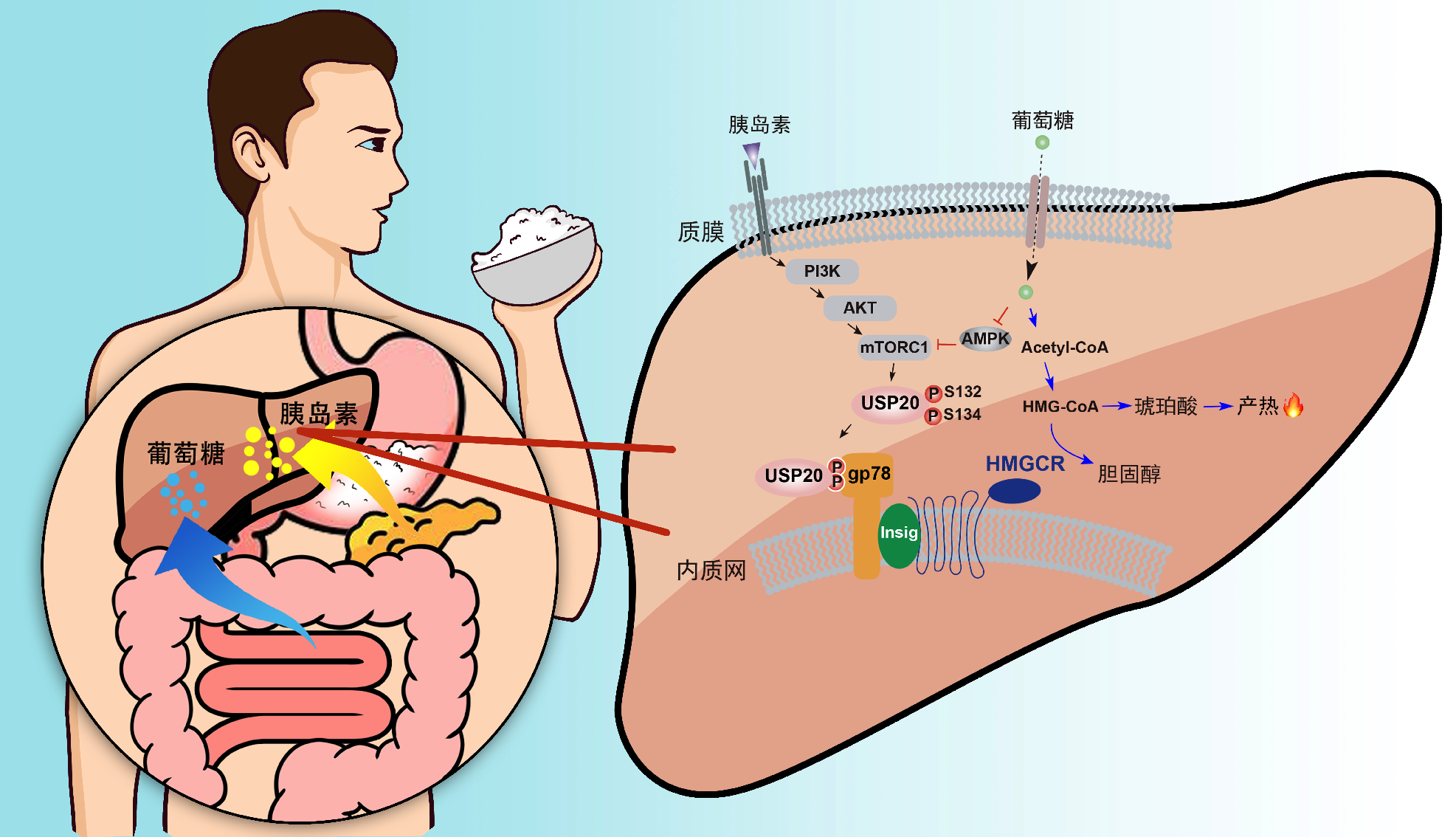 武漢大學(xué)宋保亮實(shí)驗(yàn)室在膽固醇領(lǐng)域取得新的突破,該團(tuán)隊(duì)發(fā)現(xiàn)進(jìn)食碳水化合物后,血液中升高的葡萄糖和胰島素促使肝臟中USP20蛋白被磷酸化修飾,USP20穩(wěn)定膽固醇合成途徑限速酶HMGCR,從而上調(diào)膽固醇合成。抑制USP20,降低血脂、減肥及增加胰島素敏感性。該發(fā)現(xiàn)不僅揭示了人體的營(yíng)養(yǎng)感應(yīng)機(jī)制,還證明USP20可以作為新的降脂藥物研發(fā)靶點(diǎn)。這一研究成果及其應(yīng)用將惠及全民健康。